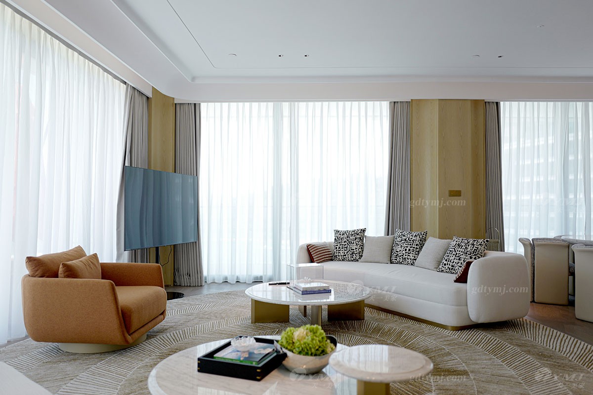 本案為現(xiàn)代極簡奢華設計風格,以白色,原木色為主基調(diào),以灰、藍、紅、咖啡棕等色調(diào)為輔,作為點綴裝飾,以增加空間的層次感和活力,并融入了深圳特有的海洋文化元素;墻面裝飾大量運用原木色波浪木紋、弧形轉(zhuǎn)角造型;獨特的懸浮式吊頂及采用無主燈設計,簡約又時尚;簡潔流暢的線條設計,純粹的色彩搭配,大理石、金屬等材質(zhì)的運用以及細節(jié)的工藝處理,無不彰顯極簡風格的精髓,注重功能實用性的同時,追求形態(tài)與功能的完美結(jié)合,整體在視覺感受上體現(xiàn)了一種清新自然,舒適雅奢的氛圍,與酒店的整體設計完美融合。