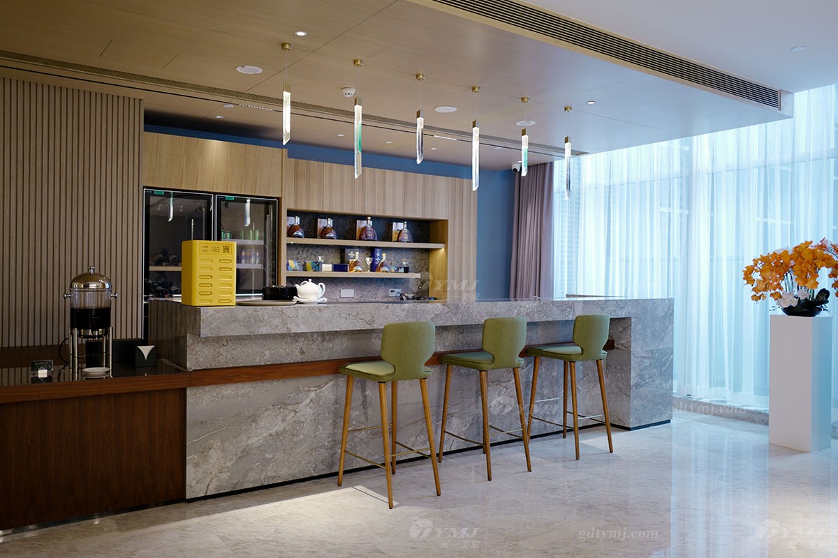 穿過電梯過道,即是酒店前臺服務大堂,空間敞亮,原木色木條裝飾而成的吊頂,造型獨特的不銹鋼金屬球形燈,別具一格。隔壁的吧臺由實木結(jié)合大理石打造而成,旁邊一張兩米多實木長功能桌,紋理深邃細膩,凸顯高質(zhì)感和檔次,可以點一杯咖啡,坐在吧椅上跟朋友一起細細品味、隨意聊天,很是愜意。
