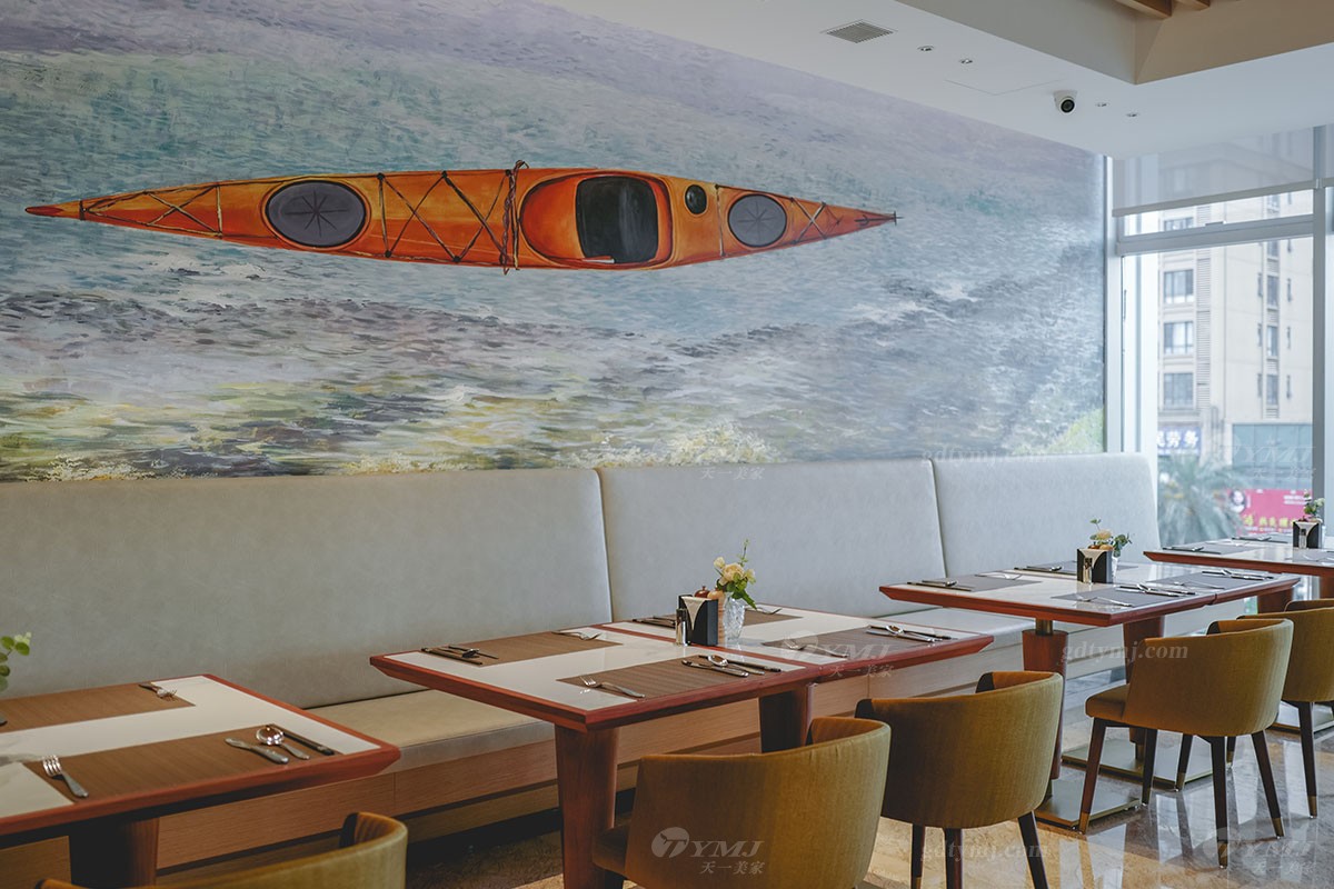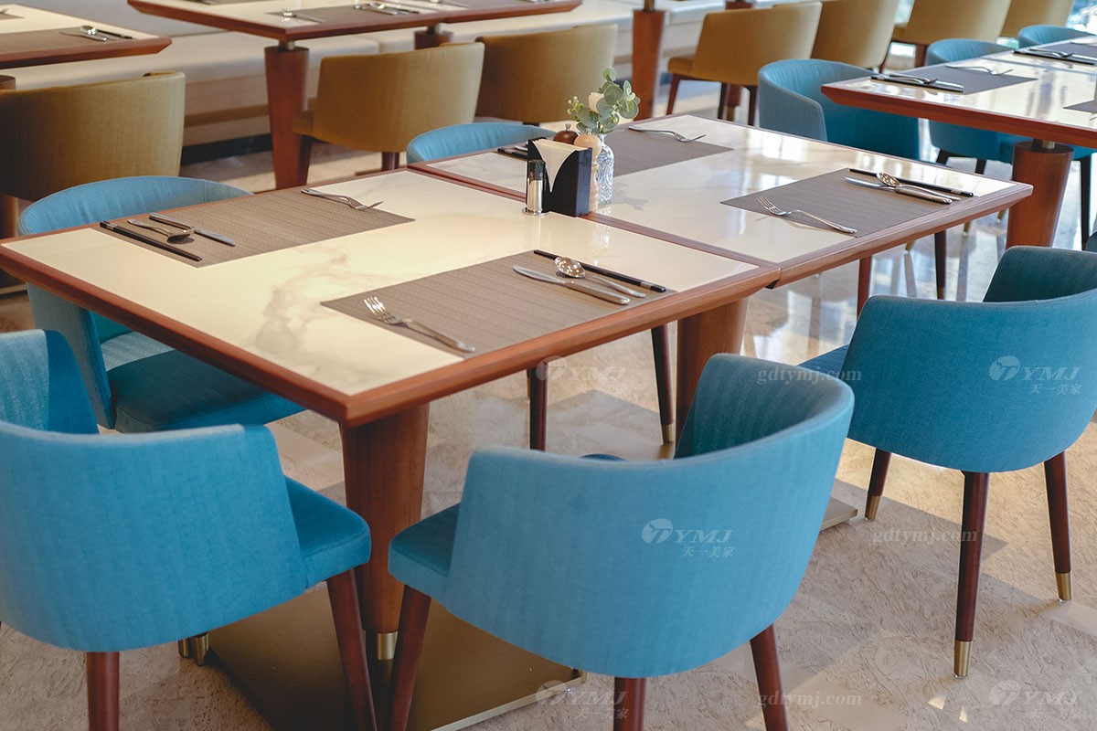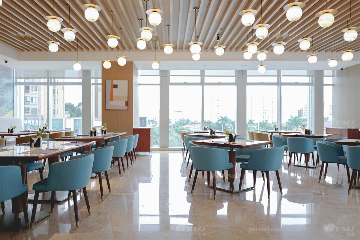 清新雅致的酒店自助餐廳,空間寬敞明亮,實木方形的小餐桌,表面紋理質(zhì)樸、觸感溫潤,金屬底座的巧妙融入,帶來很強的時尚現(xiàn)代感同時多了一份優(yōu)雅,精心制造的北歐風實木餐椅,藍色和嫩綠色的布藝椅面相得益彰,整個餐廳呈現(xiàn)出清新自然、北歐風情滿滿的氛圍,瞬間打開你的味蕾,沉浸于這份難得的寧靜與美食的享受當中。