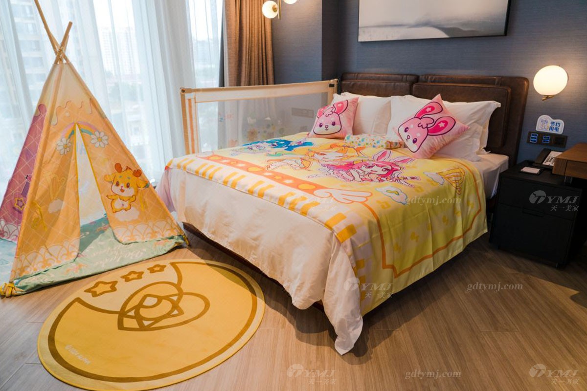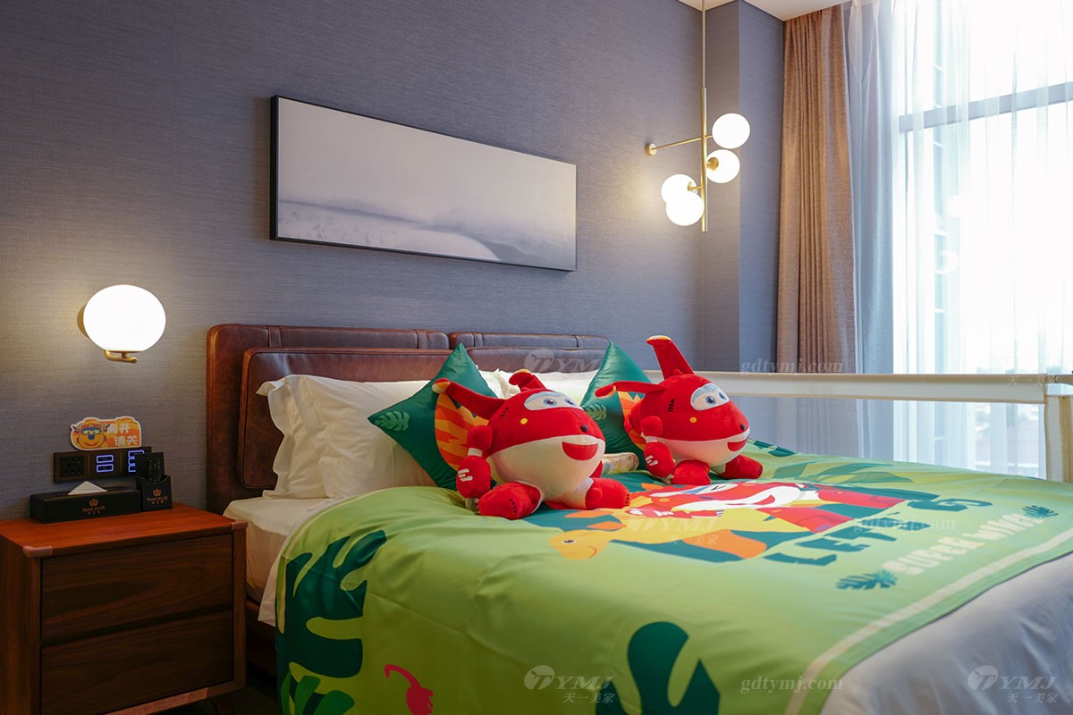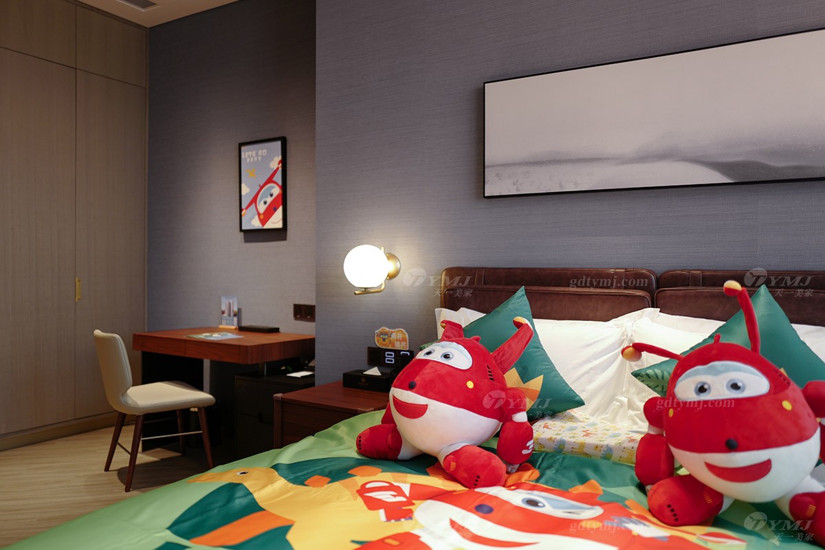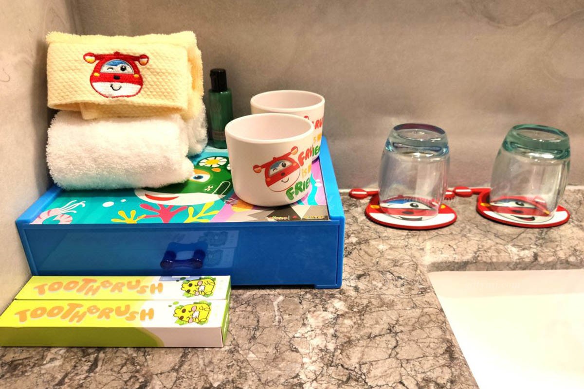 溫馨有趣的主題親子房分別以小朋友非常喜愛的兒童動畫片《超級飛俠》、《豬豬俠》、《巴啦啦小魔仙》等系列為主題而進行精心設計打造,無論是客廳、臥室,還是洗手間的布置裝飾,隨處都可見到主題動畫里活潑有趣勇敢的主角們的元素,主題親子房還配備了相關的兒童帳篷、玩偶、小滑梯,小動物坐凳等等,通過這些透露著愛與細致、并融入了主題元素的活動家具軟裝的點綴裝飾,讓房間內(nèi)瞬間充滿活力與趣味性,營造出一個既溫馨自然又充滿趣味與想象力、大人和小孩都能樂享其中的美好空間。