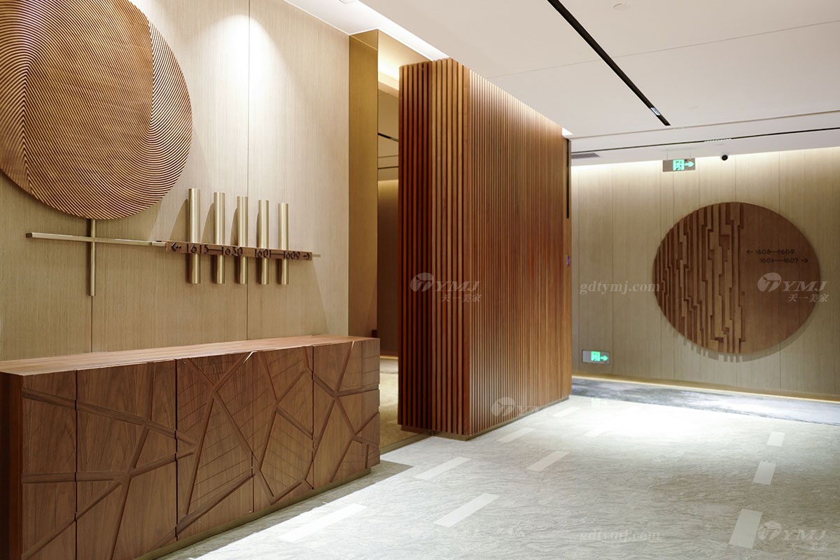 酒店入口處一張簡約時尚的實木功能服務臺,綠色吧椅,原木實木長條凳,簡潔實用,為到訪的賓客提供全方位的指引服務,原木實木裝飾柜,表面做不規(guī)則實木條裝飾設計,墻面鑲掛一塊實木條紋大圓盤,整體呈現(xiàn)出東方文化韻味的“方圓”格局,旁邊搭配的一抹綠植,營造出原汁原味的自然視覺感。