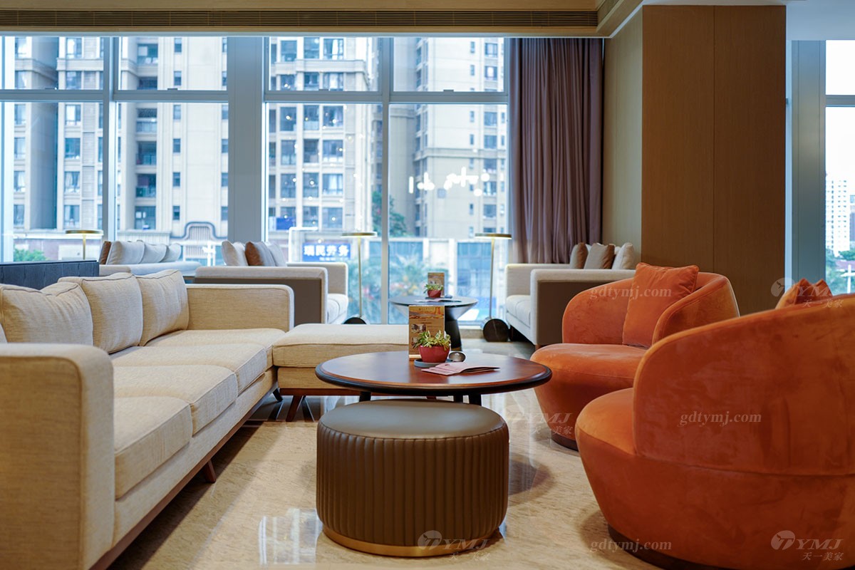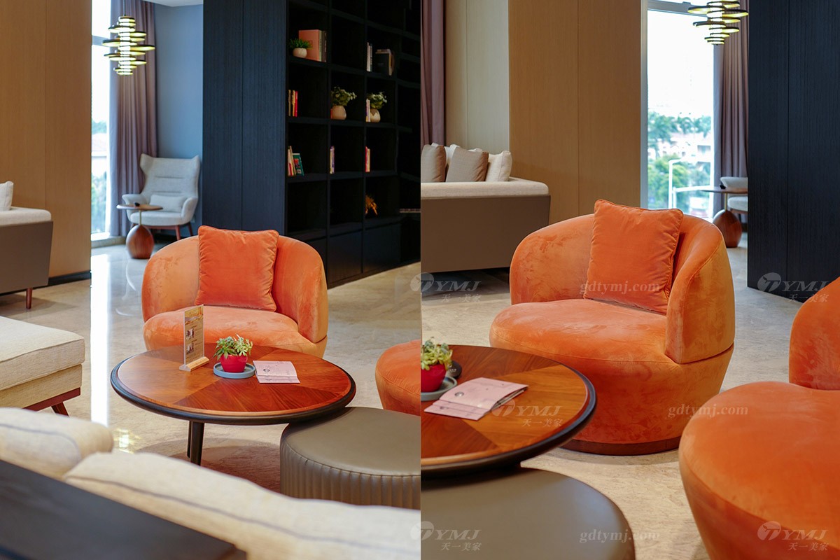 公共休閑洽談區(qū)擁有270°全景超大落地窗,自然采光非常充足,挑高的天花頂,讓空間通透明亮,柔和的燈光下,整體呈現(xiàn)灰色調(diào)布藝沙發(fā)中散落幾抹亮橙色休閑椅,使得整個氛圍活躍起來,搭配精致的裝飾,讓每一處細節(jié)都透露著不凡的品味。在繁忙的旅程或商務日程中,這是一處不錯的靜謐而又不失格調(diào)的休憩之地,坐在舒適沙發(fā)上既可覓得片刻寧靜的個人時光,亦或可與重要伙伴閑聊、會談。