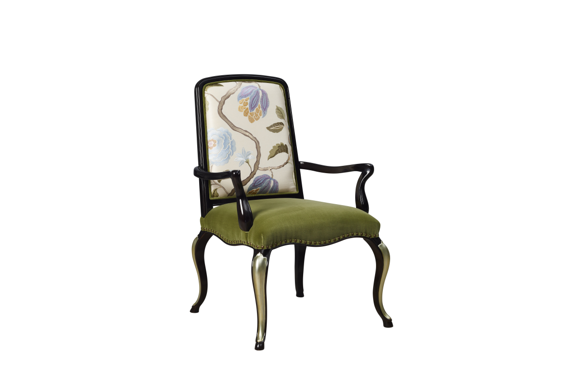 優(yōu)雅的曲線扶手,椅腿貼鈴蘭花造型的木皮,涂裝香檳銀色為裝飾,整體設(shè)計(jì)靈動(dòng)精致,桌墊采用時(shí)尚的草木綠色絲絨軟包,搭配彩色繡花靠背,色彩搭配清新優(yōu)雅,為空間增添了一抹鮮活,營(yíng)造出一種恬靜與美好的生活氣息。