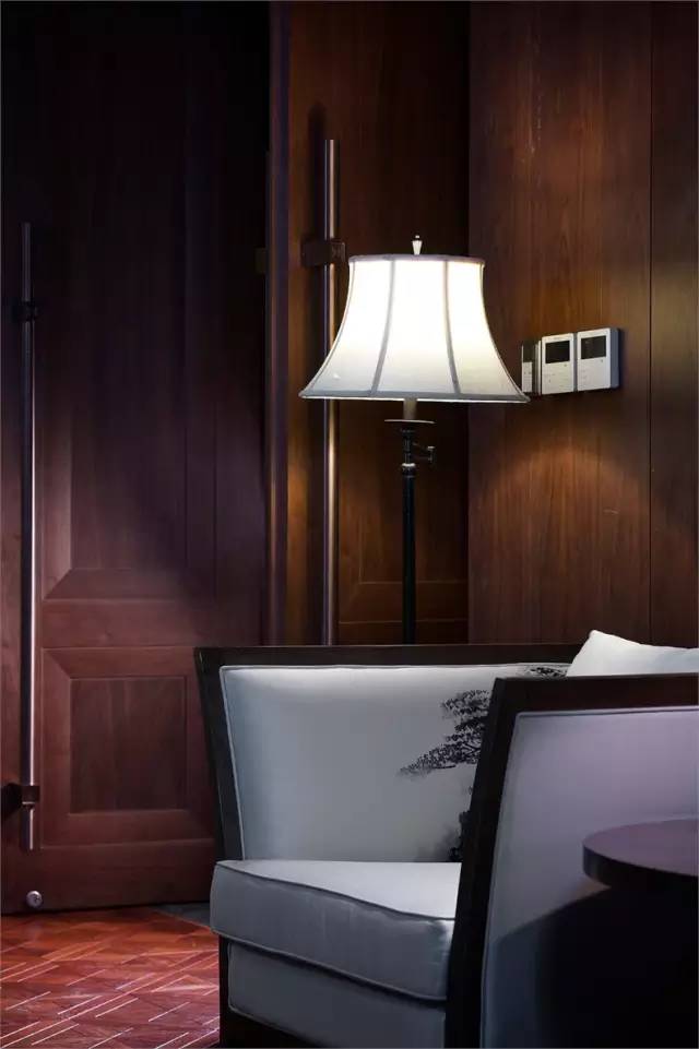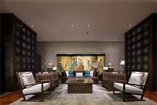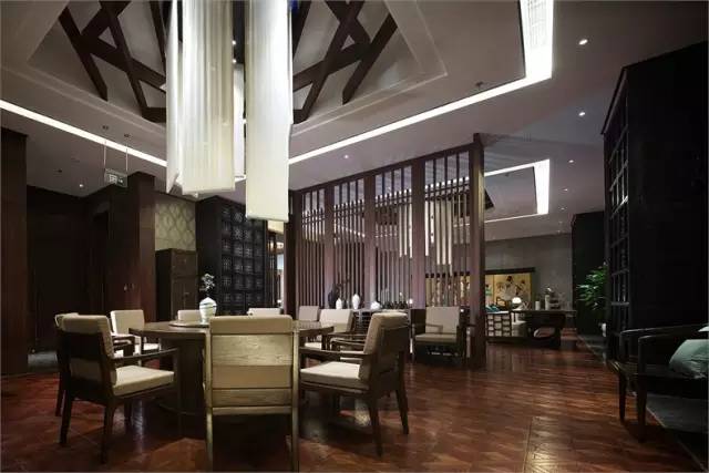 踏著木地板,輾轉進入會客餐包,空間設計整體古樸且高貴,色彩順應古風,厚重且雅致,懸空而下的絹絲與古屏風相映成趣,成為空間濃墨重彩的一筆。木質格柵“隔而不斷”,加深空間層次感,凸顯中國傳統藝術的精妙。