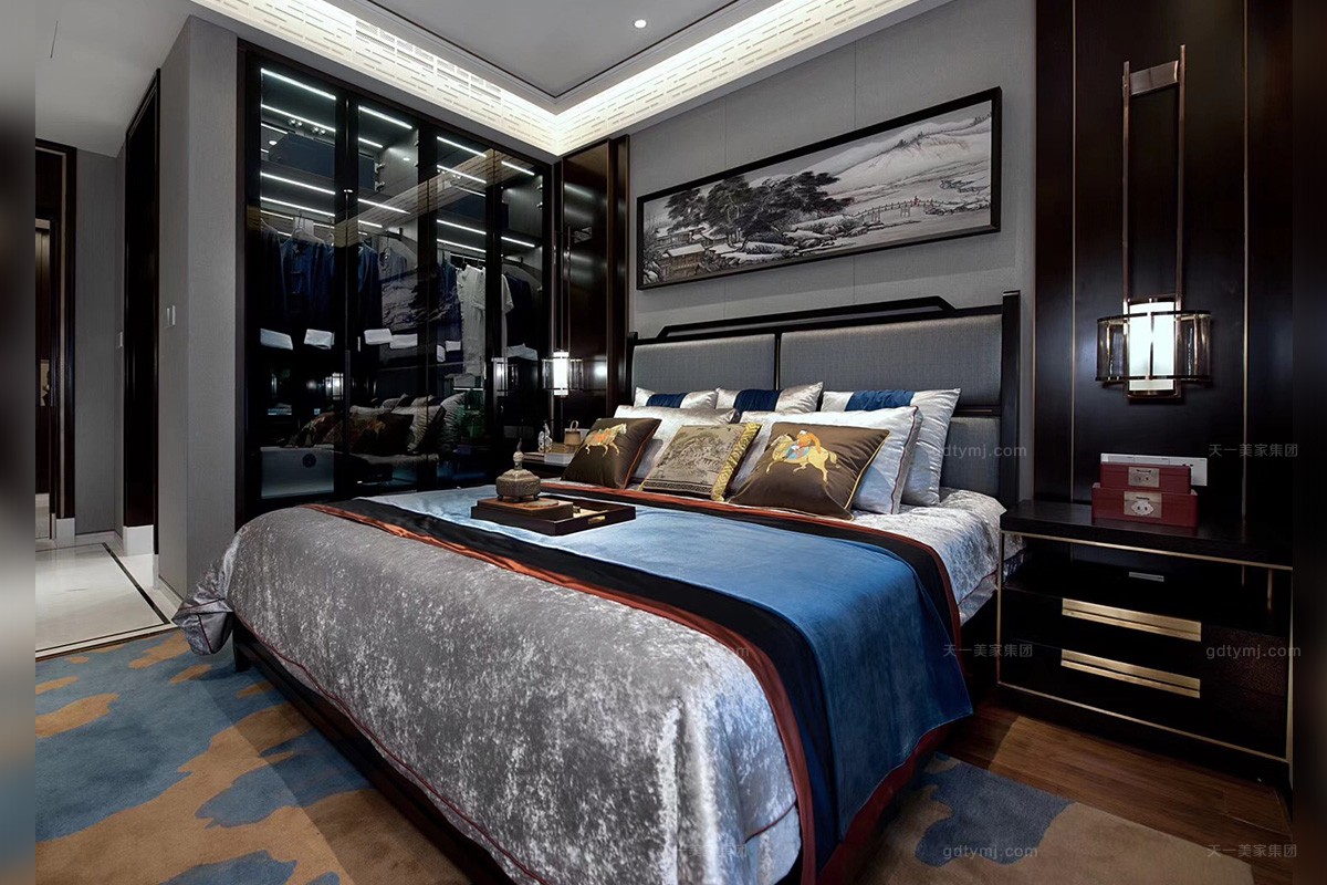 同樣臥室以灰色搭配黑色的主色調,輔以其他顏色點綴,加上古銅拉絲五金條裝飾,床頭的山水人文裝飾畫,讓整個臥室空間呈現一種奢華而不俗氣,簡約而又不失品位的質感。