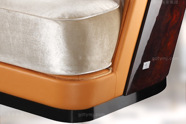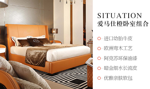 高端后現代風輕奢臥室家具橙色皮桃木紋飾板真皮臥室床組合