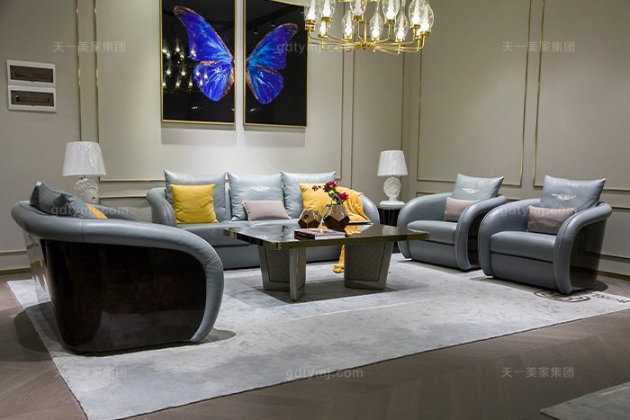 高端別墅家具品牌輕奢后現代客廳藍色真皮實發組合