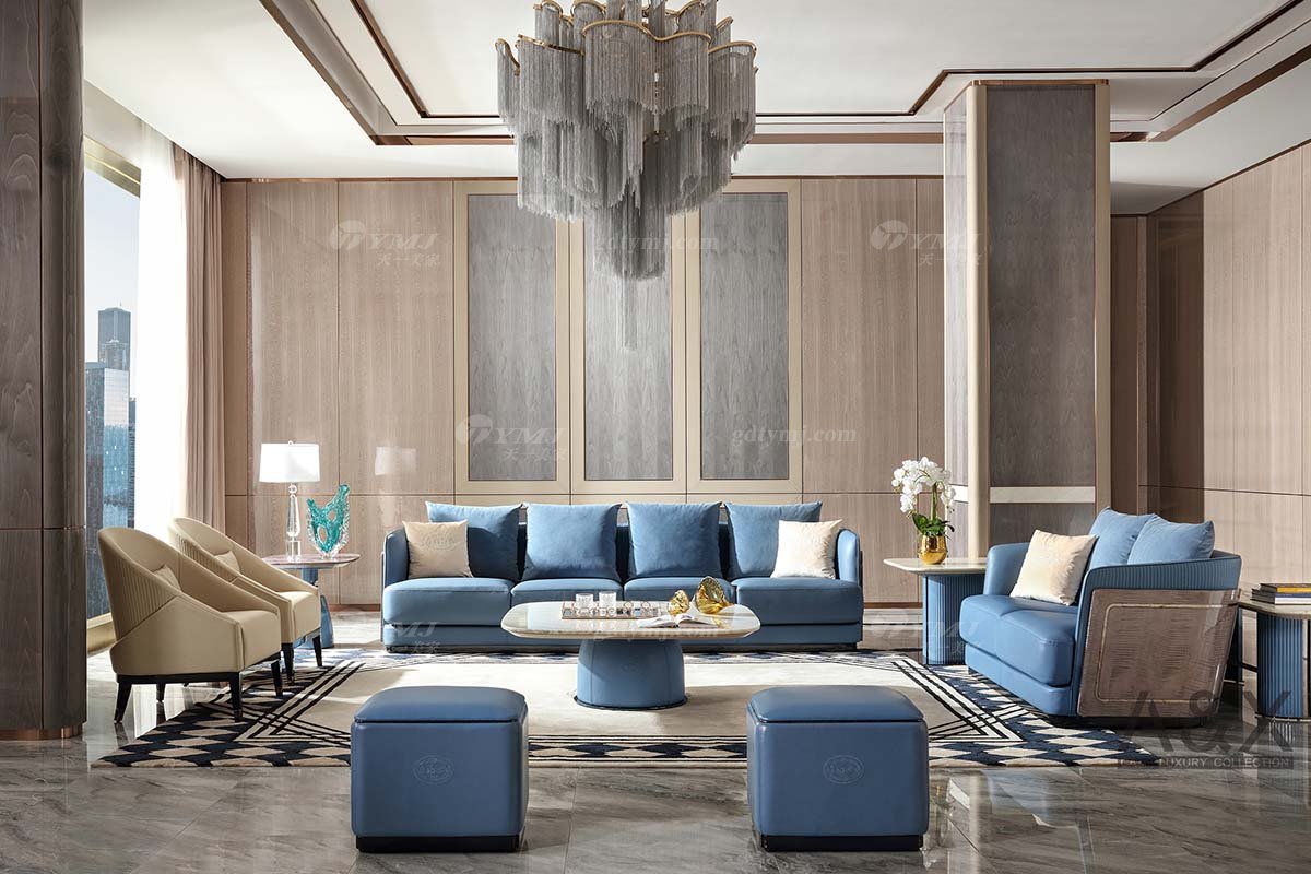 高端別墅家具品牌輕奢后現代海圖藍色真皮客廳沙發組合