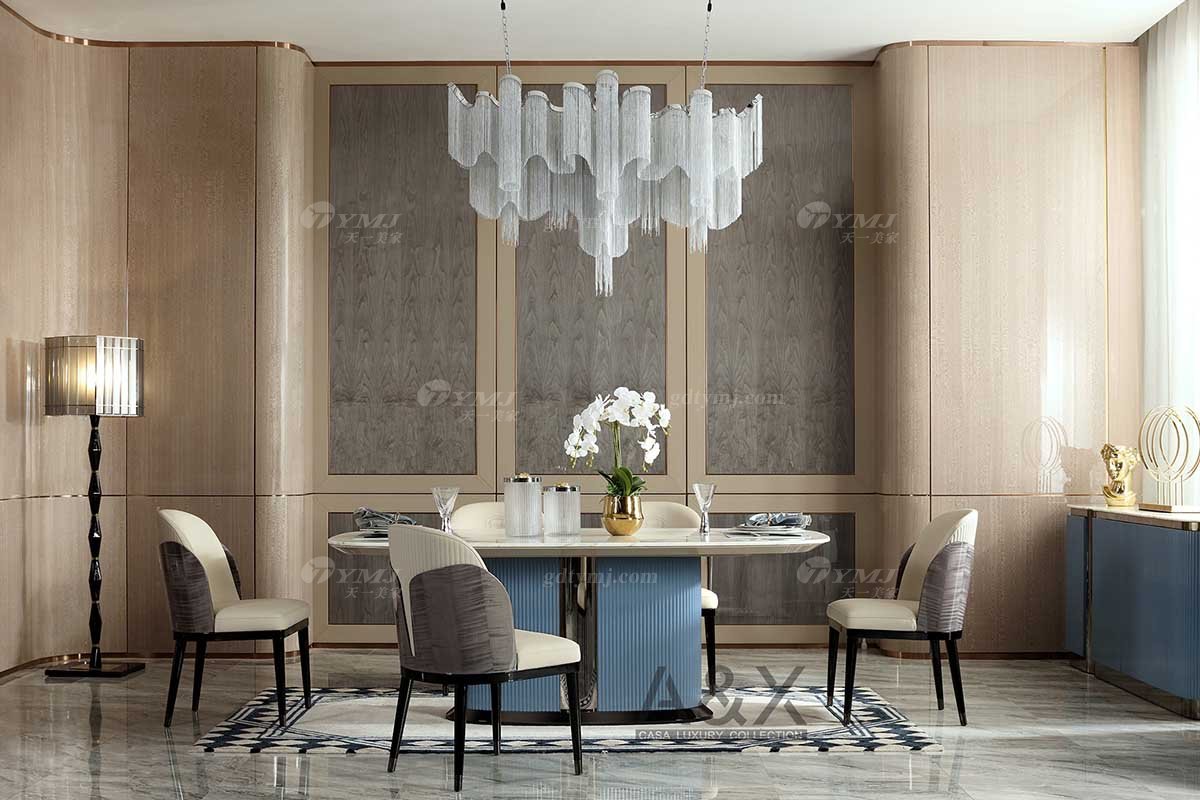 奢華別墅家具品牌輕奢后現代海圖藍色真皮餐廳餐桌餐椅組合系列